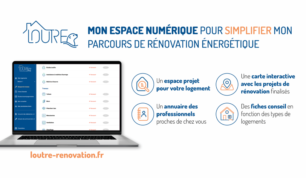 LOUTRE sera votre plateforme de suivi en ligne et centralisera les informations de votre projet. Vous serez mis en relation avec un conseiller qui vous aidera tout au long de votre projet : état des lieux initial, choix techniques et aides financières.