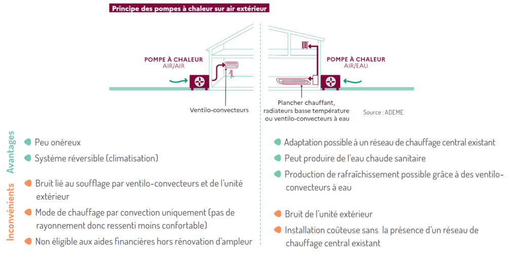 Dans la suite de cette fiche nous nous concentrerons sur les PAC aérothermiques qui représentent une part importante des installations dans la région. En effet, les températures hivernales clémentes permettent d’assurer un fonctionnement performant de ce type de système même en plein hiver. Le surcoût élevé d’un forage pour l’installation d’une PAC géothermique est donc rarement justifié.