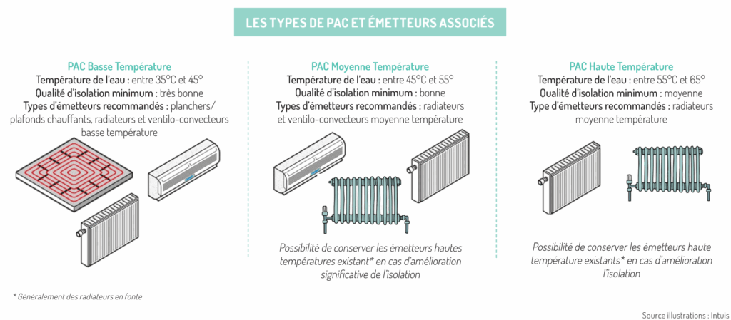 Pour produire du chauffage, une pompe à chaleur (PAC) prélève un peu de chaleur d’une « source froide » (sol du jardin, air environnant ou eau d’une nappe), augmente son niveau de température et la restitue à une température plus élevée dans le logement. Une pompe à chaleur est d’autant plus efficace que la différence entre la température du milieu où est puisée la chaleur et celle des émetteurs de chaleur du logement est réduite. Sa performance pourra être moins bonne par grand froid ou par journée très humide (pour les systèmes aérothermiques). Mais même à une température négative, elle consommera en moyenne deux fois moins qu’une chaudière ou que des radiateurs électriques.